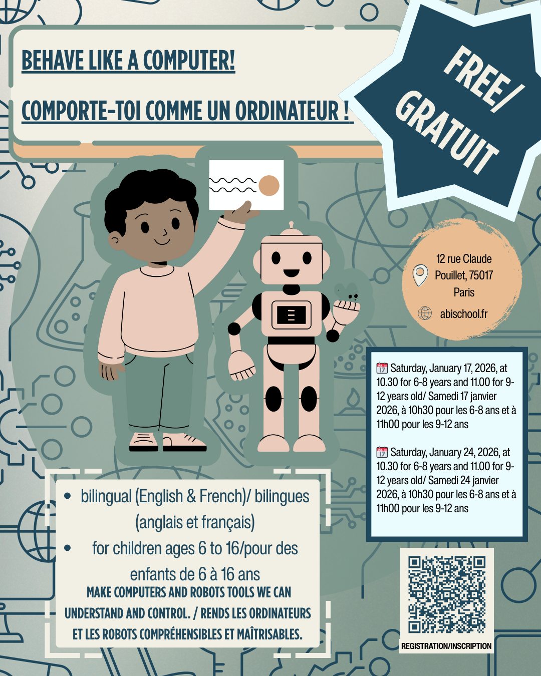 Notre objectif est double : comprendre les limites des ordinateurs et des robots, et découvrir tout ce qu’ils rendent possible. À la fin de l’atelier, ordinateurs et robots paraîtront moins magiques — et davantage comme des outils que l’on peut réellement comprendre et maîtriser.