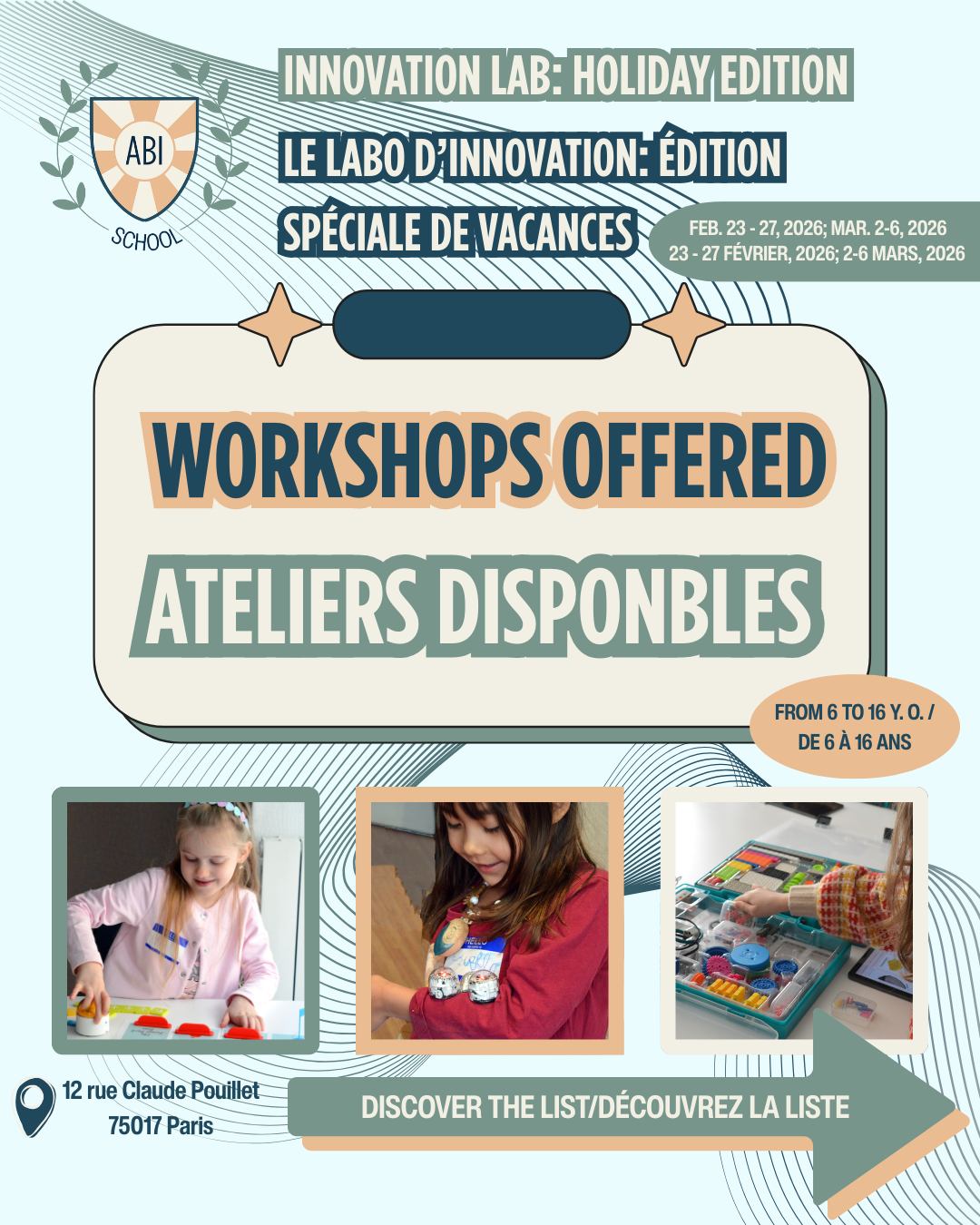 Faites défiler pour découvrir TOUS les ateliers incroyables que votre enfant peut explorer les 23-27 février 2026 et les 2-6 mars 2026 ! 🚀