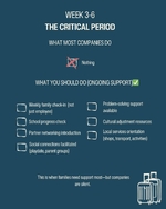 ✓ Week 3-6: The critical period (weekly check-ins, social connections)