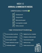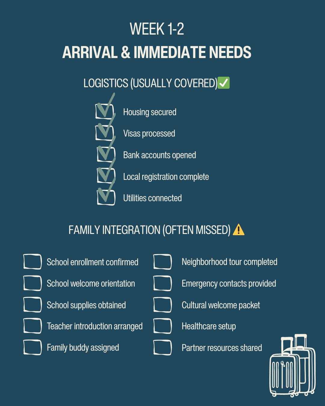 ✓ Week 1-2: Beyond logistics (school, family buddy, cultural orientation)