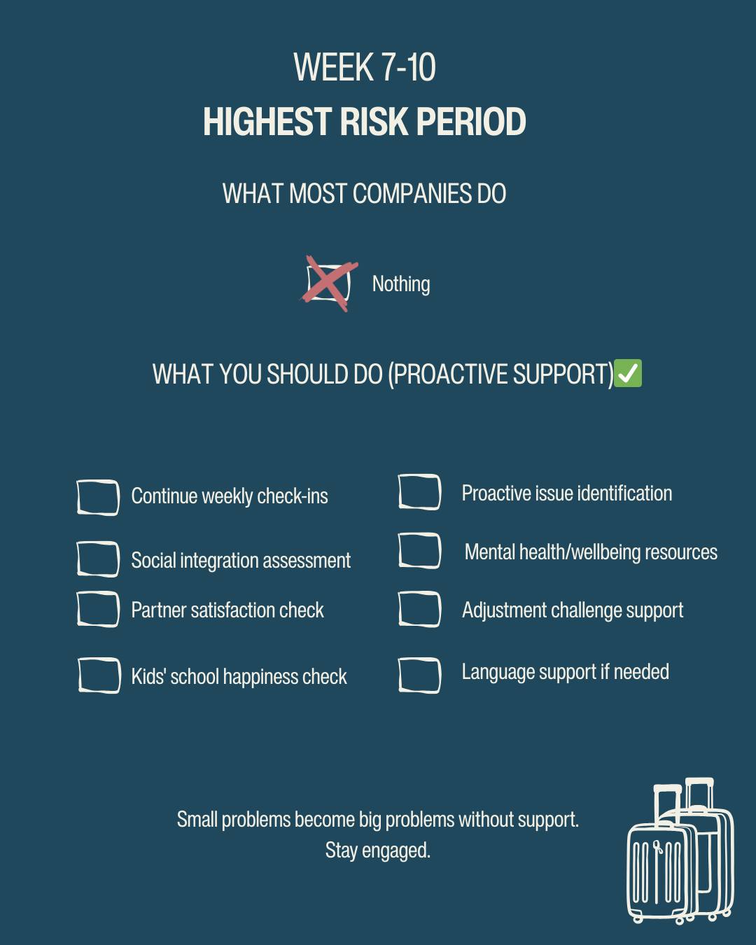 ✓ Week 7-10: Highest risk (proactive support, problem-solving)