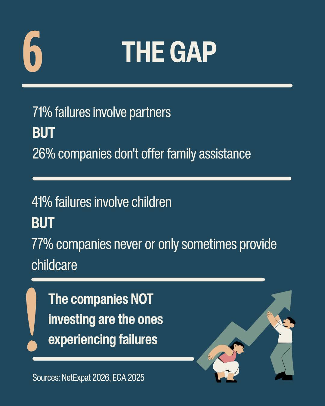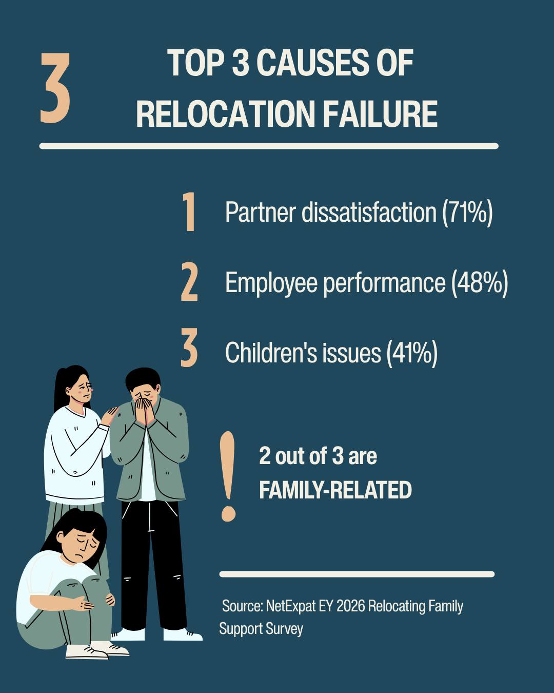 According to the NetExpat EY 2026 Relocating Family Support Survey, 71% of failed relocations involve unhappy partners. 41% involve children's issues.